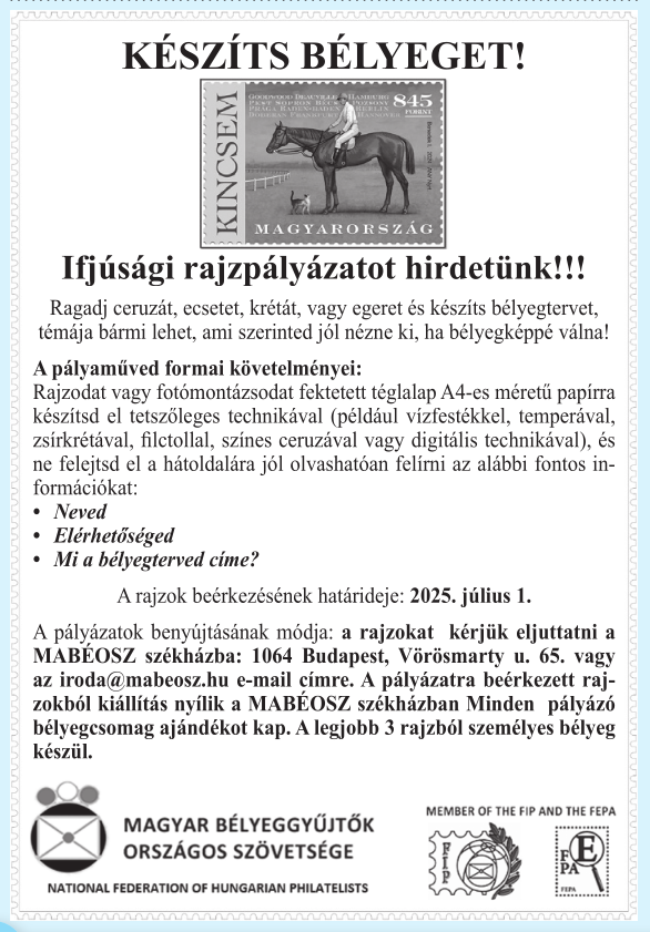 A pályázatra beérkezett rajzokból kiállítás nyílik a MABÉOSZ székházban. Minden pályázó bélyegcsomag ajándékot kap. A legjobb 3 rajzból személyes bélyeg készül.